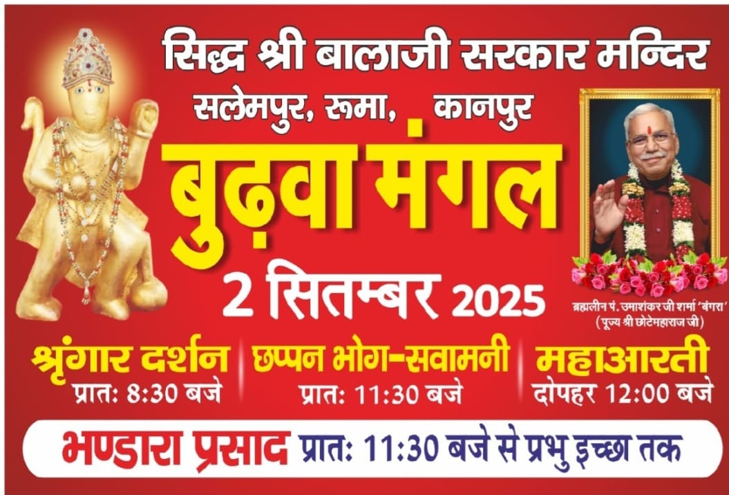 भाद्रपद मास के अंतिम मंगलवार को बुढ़वा मंगल दिनांक 02/09/2025 को माँ अंजनी के दुलारे हम सबके परमपूज्य पवनपुत्र हनुमान जी महाराज का उत्सव पूर्व की भांति खूब धूमधाम से मनाना सुनिश्चित है। इस पुण्य अवसर पर आप सब सपरिवार कार्यक्रम में सम्मिलित होने के लिए आमंत्रित है ।